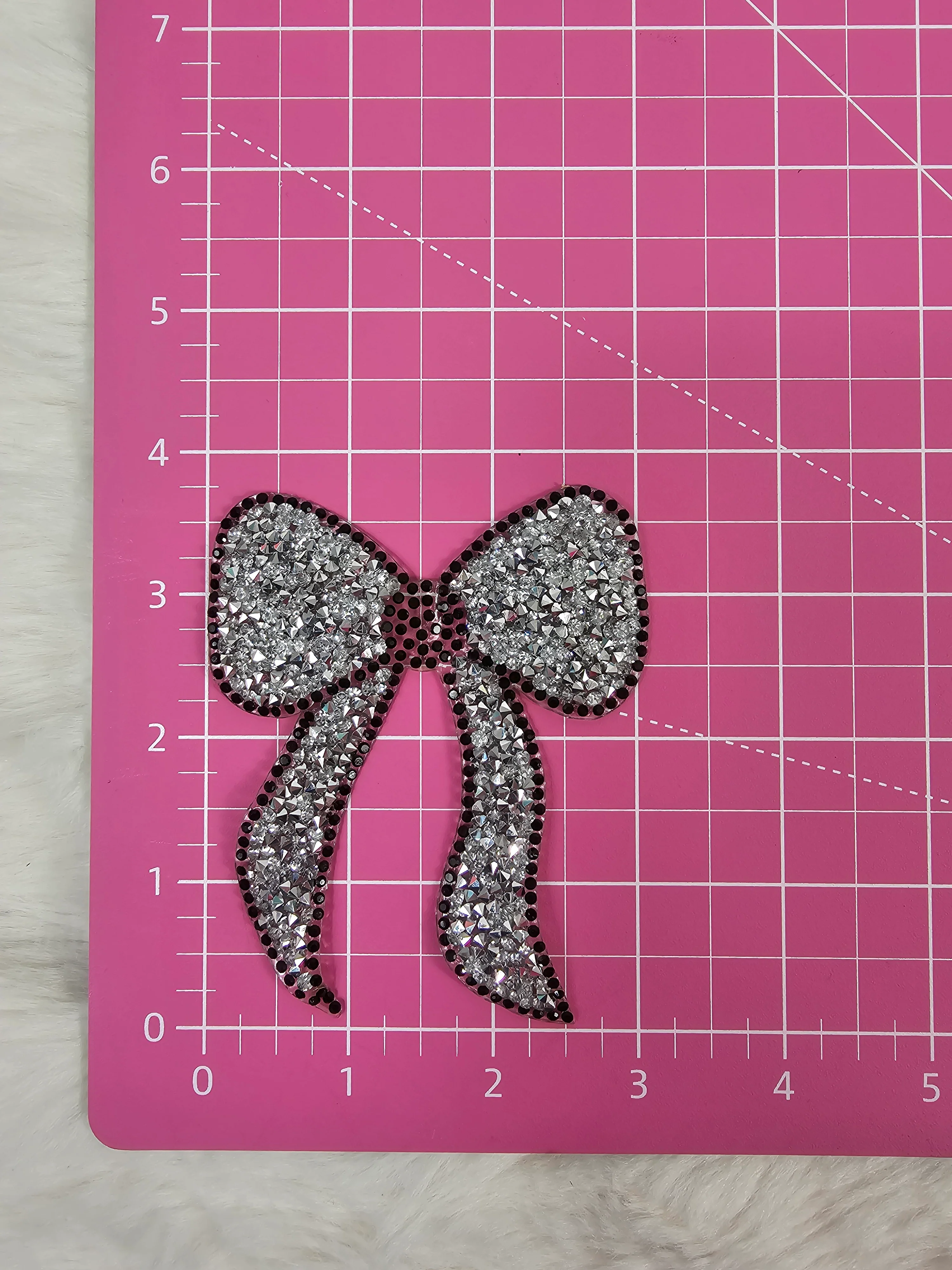 Rhinestone Bow with Black Outline and Silver Iron-on Patch