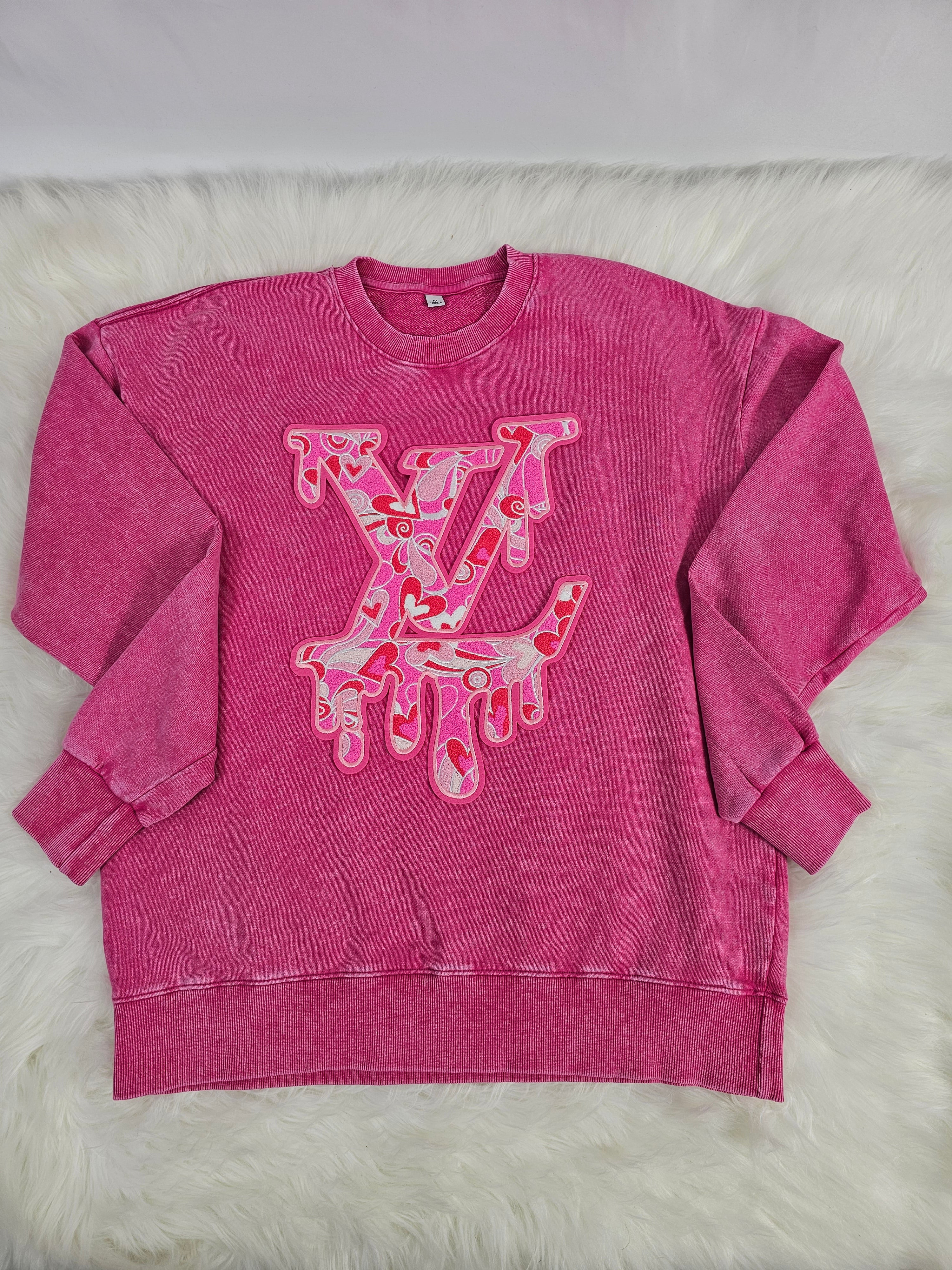 L V Drip with Pink Hearts on Pink Felt Chenille Iron-on Patch