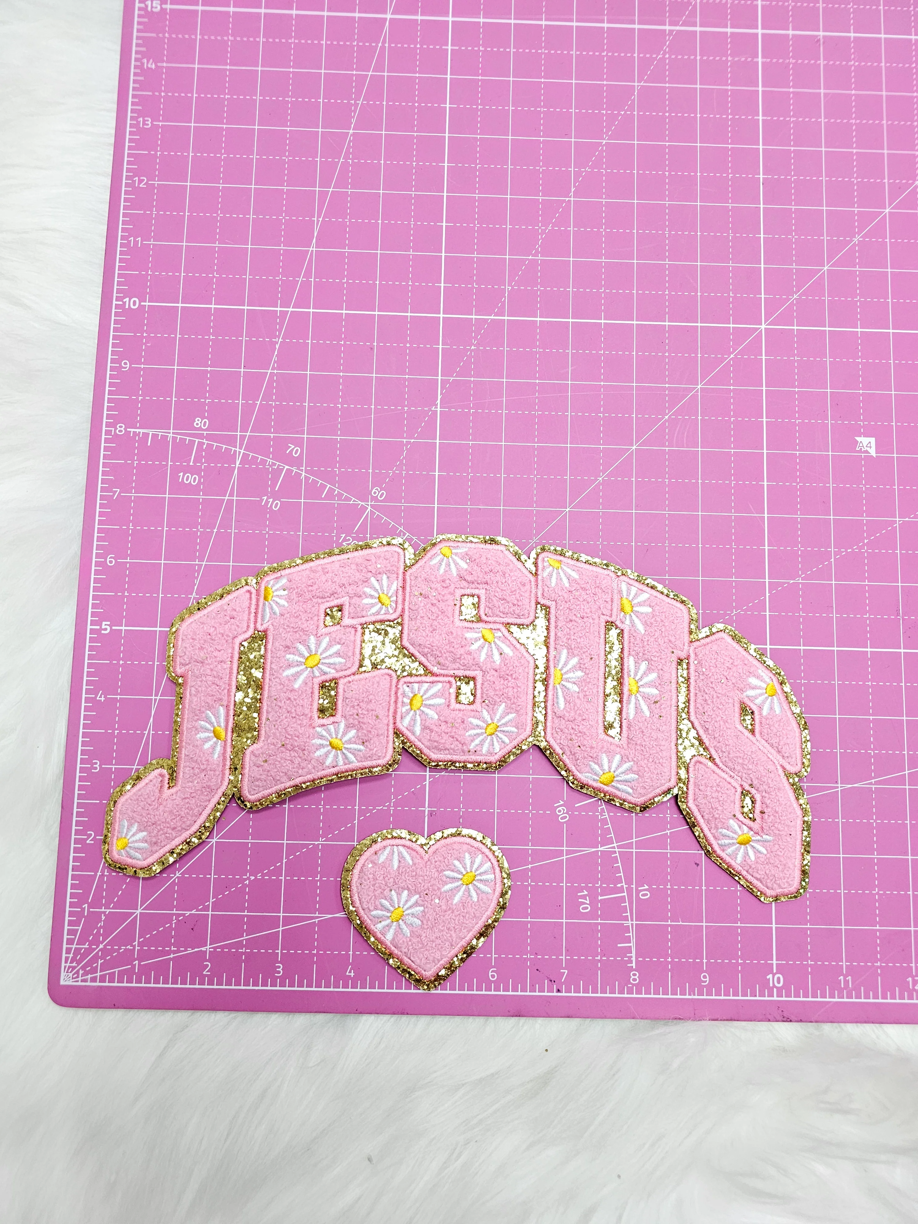 Pink JESUS with Daisy Flowers and Heart Chenille on Gold Glitter Iron-on Patch